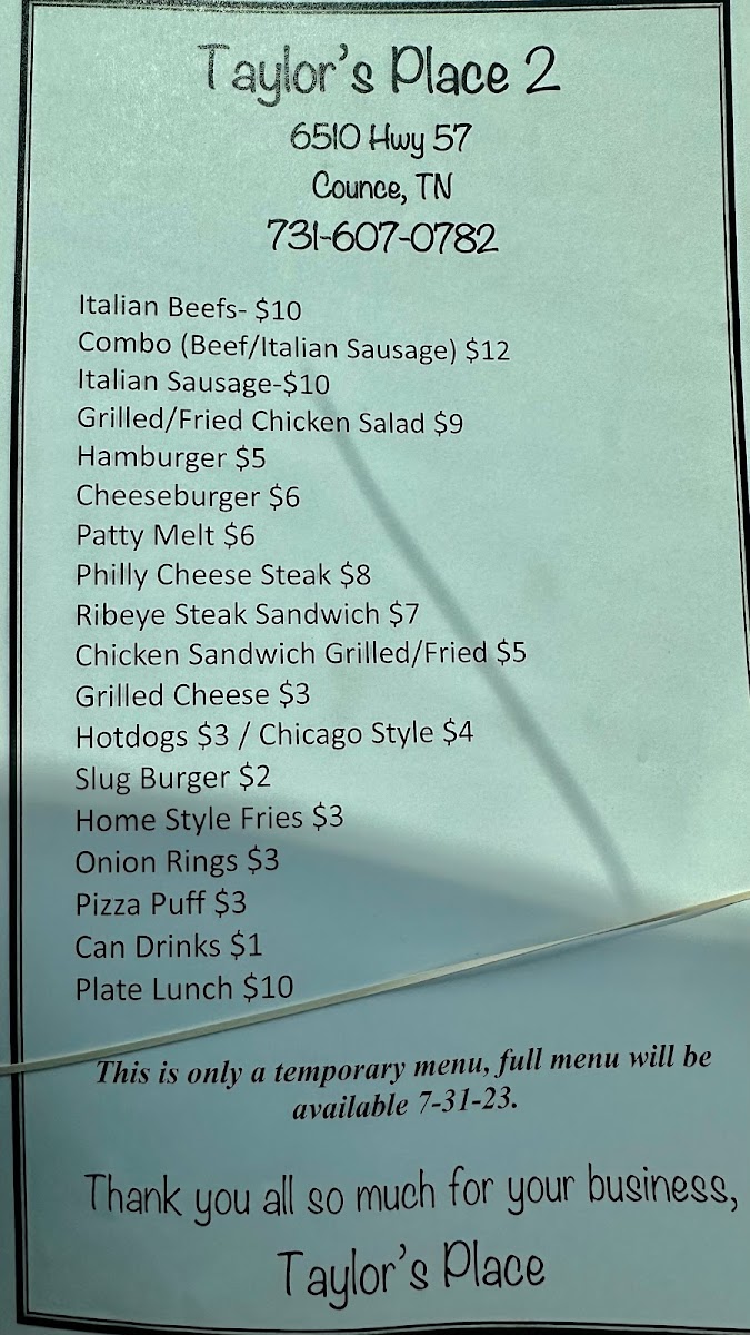 Tucked away along the scenic stretch of Highway 57, Taylor's Place 2 at 6510 TN-57, Counce, TN 38326, United States, feels like that kind of small-town gem you stumble upon once and never forget. The aroma hits before you even walk through the door-a mix of sizzling burgers, fresh catfish, and something sweet baking in the back. The atmosphere is welcoming, with friendly chatter from regulars who clearly treat this place like their second home. It’s the sort of diner where time slows down, and you can actually taste the heart that goes into every plate.